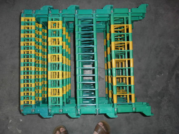 組合式塑料周轉(zhuǎn)箱是由幾個(gè)塑料部件組裝而成的,特別適用于齒輪,園扁型工件生產(chǎn)現(xiàn)場的周轉(zhuǎn)和清洗。由于工件周邊均為軟接觸、使工件隔離裝載,不相互碰撞或損壞,又由于周邊均為可視隔架,工件在不移位的同時(shí)即可完成清洗。組合箱結(jié)實(shí)美觀,堆疊方便,是提高產(chǎn)品質(zhì)量和企業(yè)形象的理想工具,目前已在東風(fēng)汽車公司、神龍汽車公司及大同、西安、武漢、浙江等地區(qū)得到廣泛應(yīng)用。